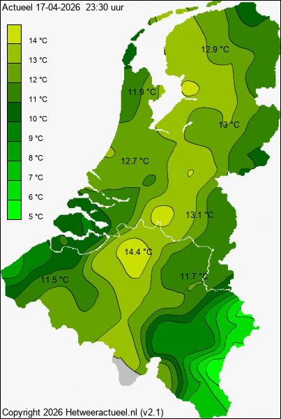 Het kaartje met de actuele temperatuur wordt iedere 10 minuten opgebouwd uit de actuele gegevens van alle weerstations, mits de data minder dan 1 uur oud is.