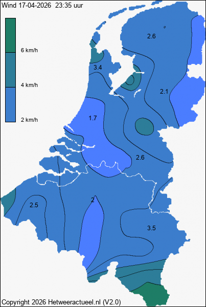 Het kaartje met de actuele wind windsneldheid (10 minuten gemiddelde) wordt 2 keer per uur opgebouwd uit de actuele gegevens van alle weerstations, mits de data minder dan 1 uur oud is.